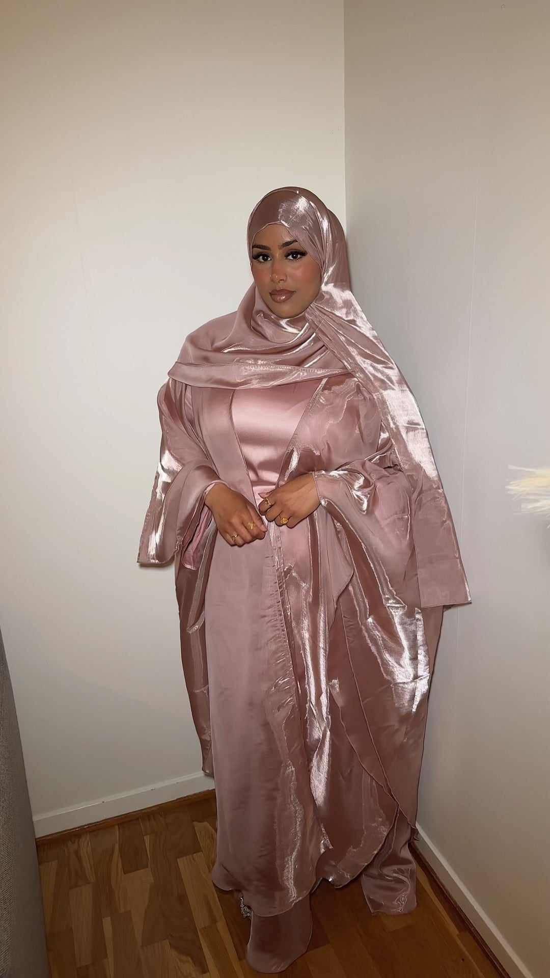 Detta 3-delars Eid-set består av en öppen kaftan-abaya, en lös innerklänning med justerbart midjeband och en matchande hijab. Perfekt för festliga tillfällen med både stil och komfort. Klänningen kan även bäras separat till vardags.